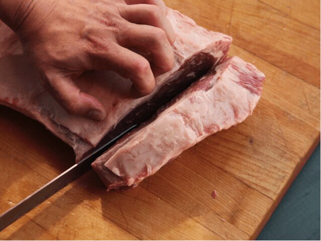 2. В зависимости от предпочтений с помощью острого, повторюсь — острого ножа!, срезаете лишние жировые волокна на сторонах отруба. Если вы приобрели отруб