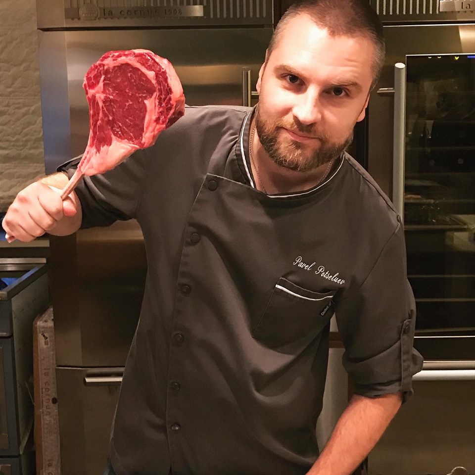 Привет. Меня зовут Павел Поцелуев, мне 36 лет. В 2012 году я впервые попробовал стейк в ресторане, и мне это блюдо безумно понравилось. На следующий дней я решил прикупить на ближайшем рынке «парную» говядину и, не получив ожидаемого стейка, расстроился. Я не был погружен в тему стейков и считал, что говядина действительно должна быть парной и ее можно купить на обычном рынке по цене в 400 рублей за кило. Решил позвонить своему товарищу повару — обсудить свой неудачный опыт и попросить совета. Друг раскрыл мне глаза и пригласил к себе на кухню — мы приготовили отличный стейк. В компании, где я раньше работал, одним из новых направлений стало мясное скотоводство, а именно мясные быки пород Абердин Ангус. Стал углубляться в эту тему все больше и больше. Со временем начал посещать кулинарные курсы, мастер-классы в стейкхаусах, устроился на стажировку в мясной цех, чтобы изучить процесс изнутри.