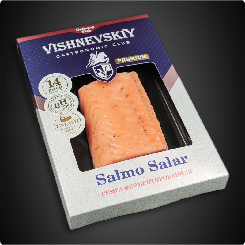Ферментированная сёмга — это изысканный рыбный деликатес оптимальной степени выдержки. Баланс между насыщенностью естественного вкуса свежей сёмги и прохладой итальянских трав можно удержать, лишь сохраняя ненавязчивую тонкость ароматов. Благородная текстура сочного атлантического лосося преображается с первых минут ферментации, как краски заката – гуще и выраженнее. Бренд Vishnevskiy Gastronomic Club — нижегородский производитель премиальных мясных и рыбных деликатесов. Отличительная особенность продукции — полностью натуральный состав, традиционная рецептура и бережное отношение к каждому этапу создания вкусового букета в технологии приготовления деликатесов, которым неукоснительно следуют мастера бренда.