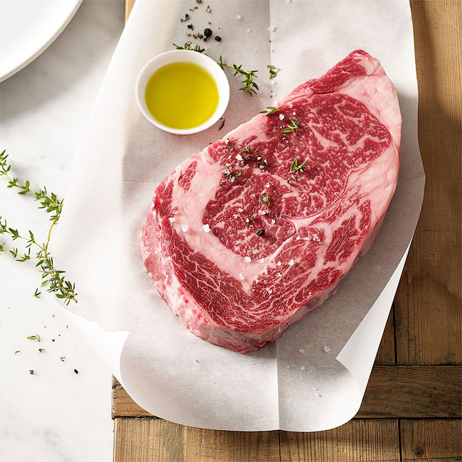 Стейк Рибай — это Достоевский в мире стейков, неоспоримая классика, с которой так или иначе знаком каждый, кто интересуется мясной культурой. Особенно если этот стейк из японской мраморной говядины Кросс Вагю (Гибрид Вагю и Голштинской породы). На языке мясников «рибай» обозначает «край на ребре», самый мясистый отруб из передней части туши. Стейк состоит из одной большой мышцы, и нескольких поменьше. Рассмотрев его, вы заметите тонкие жировые прослойки, напоминающие узор на мраморе — отсюда и пошла классификация мяса по «мраморности». Растопленный при жарке, жир пропитает стейк, сделав его особенно сочным и вкусным.