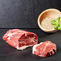 Вырез из лопаточной части мраморного бычка по степени своей нежности эта часть говядины лишь немного уступает легендарному стейку Тендерлойн, и остаётся сочной даже после основательной прожарки. Мясо прекрасно подходит как для приготовления стейка, так и нежного фарша.
