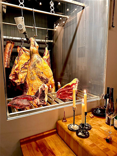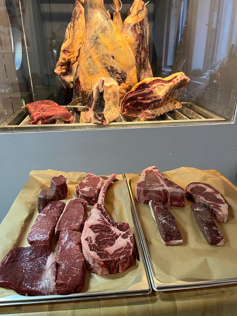 • Меню: Три вида тартара из мраморной говядины, классические и альтернативные стейки влажного и сухого вызревания, три вида соуса для стейка, гарниры и десерт.